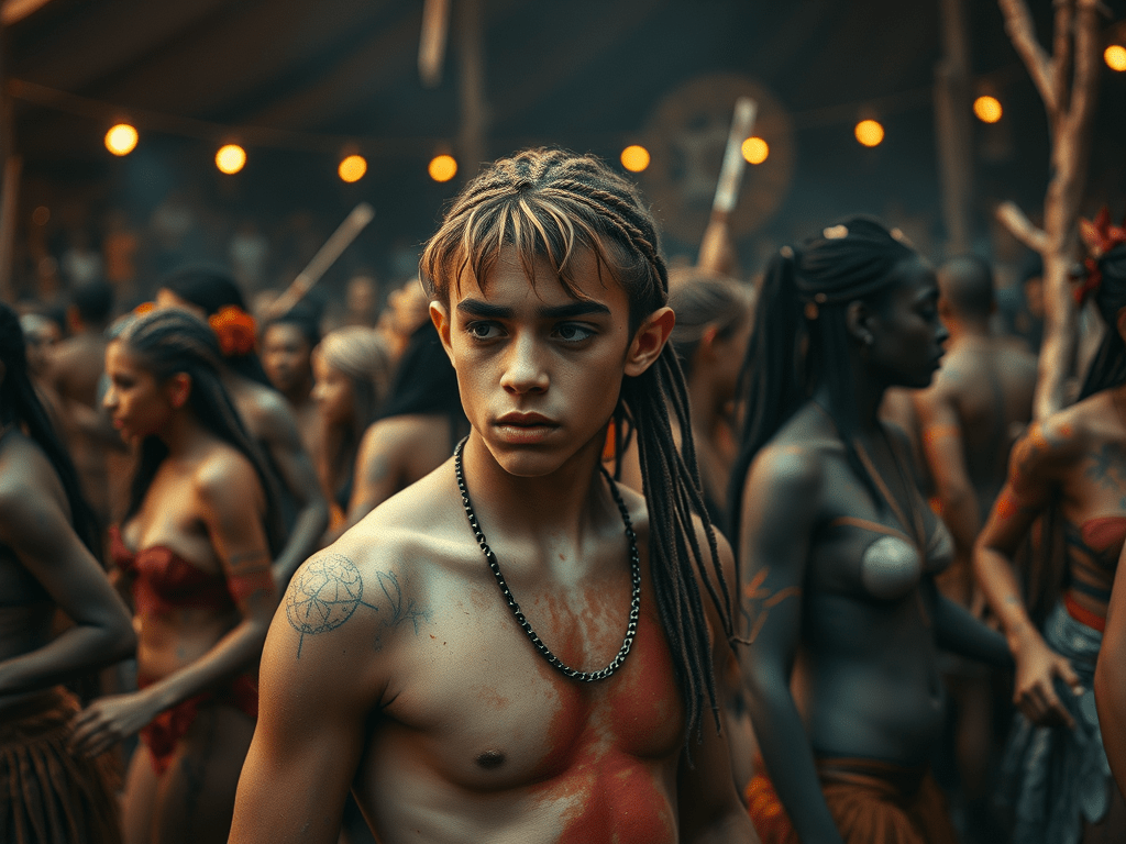 The drums grow louder, beating a hollow cadence that settles in my ribs. A makeshift stage shivers under the dancers’ feet—worn planks, splintered edges—while bodies move in looping patterns that seem to pull the crowd along like a tide. The dancers are painted in swirls of clay-red and ash-gray, streaks across arms and legs, smudges over cheekbones and foreheads. Sweat darkens the paint until it looks like the patterns are melting, living, sliding into new shapes.