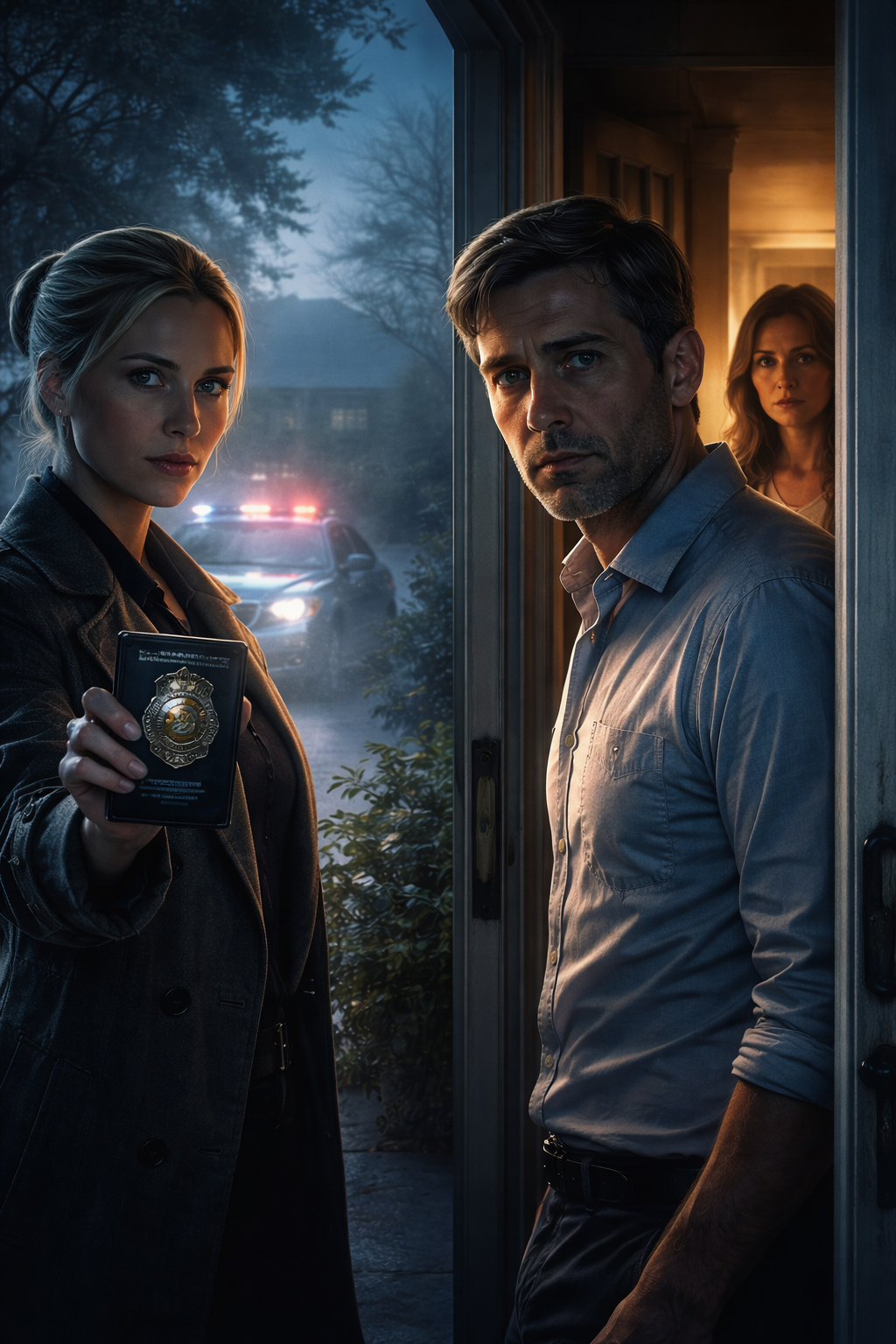 A woman stood on the porch in a dark overcoat. Blonde hair pulled into a severe bun. A badge held up at chest level, just far enough forward to be read as authority and just close enough to be threatening.