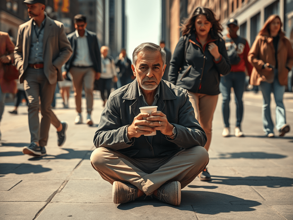 He watches feet shuffle by. Expensive leather, worn-down sneakers, stilettos that tap out a rhythm he can no longer follow. His sign, written with a marker borrowed from a tired clerk weeks ago, hangs crookedly around his neck. Spare change? Anything helps. But the streets of this city, brutal in their indifference, have little left to give.